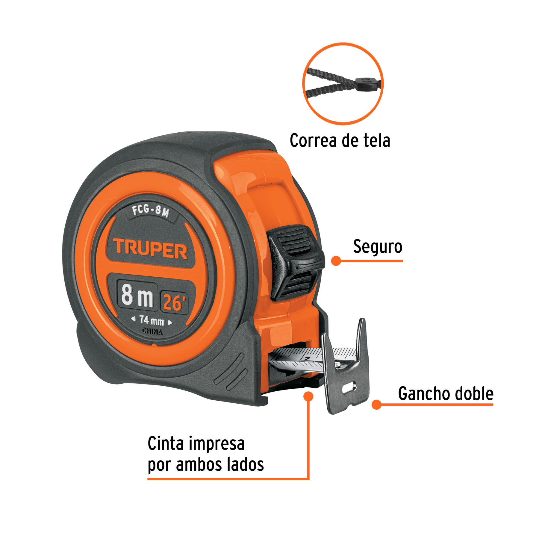 Flexómetro compacto contra impactos 8 m cinta 25 mm, TRUPER