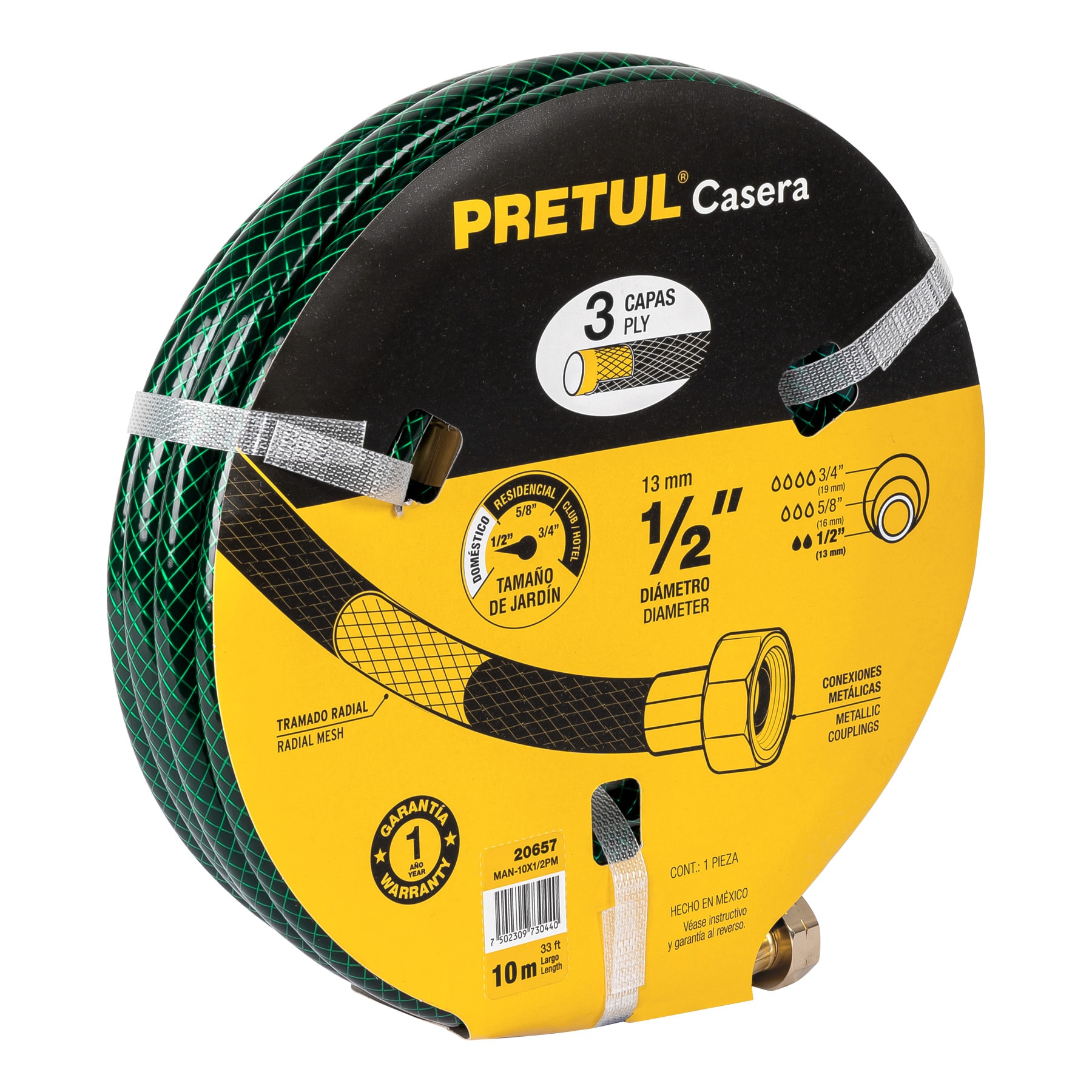 Manguera 1/2″ reforzada 3 capas conexiones metal 10m, Pretul